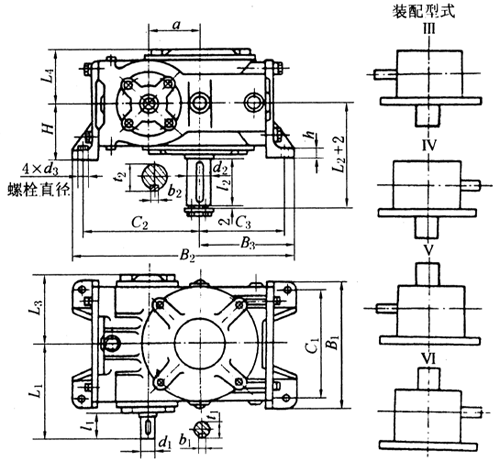 減速器的代號(hào)包括:型號(hào)、中心距、公稱傳動(dòng)比、裝配型式。
